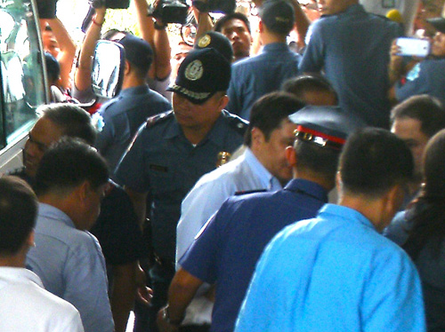 家族や支持者に付き添われて国家警察本部に出頭するジンゴイ・エストラダ議員(中央の横顔)=23日午後0時5分ごろ写す