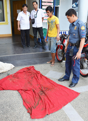黒い染みが多量に付着した毛布。不審車両が残したとみられる=11日午後2時45分ごろ、ケソン州インファンタ町で写す