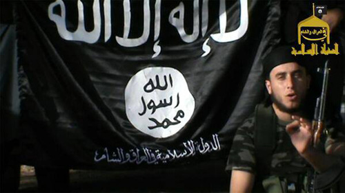 「イスラム国」の黒い旗を背景に、戦闘員を募集するネット広告