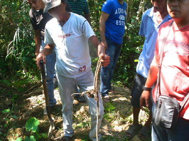 岡田さんらの遺体遺棄に使ったシャベルとロープを見せる比人男性=リサール州インファンタ町で写す