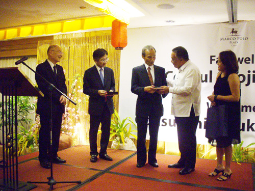 セブ領事事務所のパーティーに出席した(左から)平川新所長、石川大使、大竹前所長、前所長に謝辞を述べるヒラリオ・ダビデ・セブ州知事