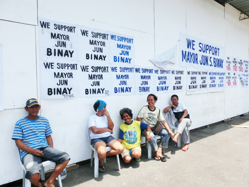 市庁舎前広場の壁にはビナイ市長支援の幕が張られている=4日正午ごろ、首都圏マカティ市で写す
