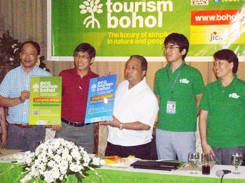 「エコツーリズム・ボホール」を立ち上げたエドガー・チャット知事、JICA派遣の平野邦臣さん(右隣)ら