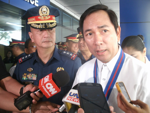 太陽光発電の設置計画を発表するペティリア長官(右)=6日午前8時20分ごろ、国家警察本部で写す