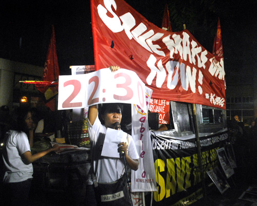 在比インドネシア大使館前で行われた死刑中止を求めるデモ=27日午後8時半ごろ、首都圏マカティ市で写す