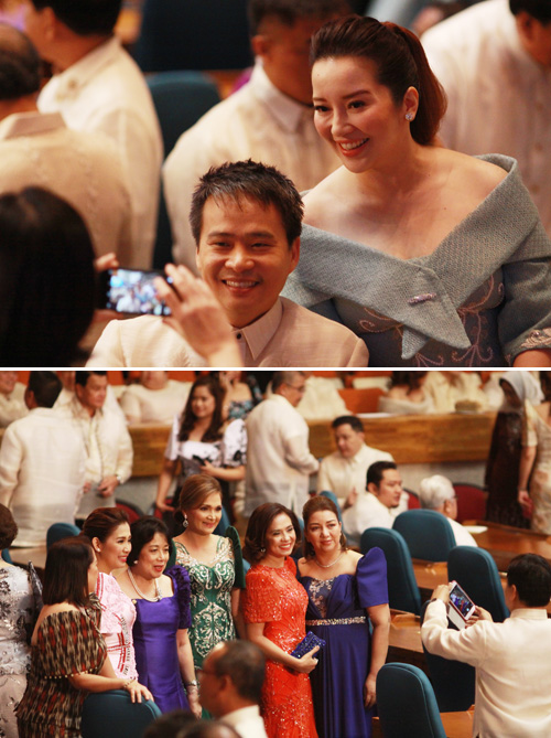 (上)アキノ大統領の妹で女優のクリス・アキノさんと記念撮影する技術教育技能開発局のビリアヌエバ局長=27日午後3時半ごろ、首都圏ケソン市で写す。(下)記念撮影する下院議員ら=27日午後3時ごろ、首都圏ケソン市で写す