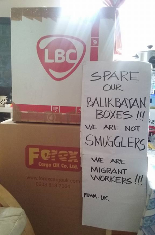 OFW支援団体の関連サイトに掲載された写真。「(関税局は)バリックバヤン・ボックスに手をつけるな。我々は密輸業者ではなく、移住労働者だ」と検査厳格化に反対している
