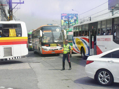 渋滞したエドサ通りで取り締まりをする警官=7日午前9時半ごろ、首都圏ケソン市で写す