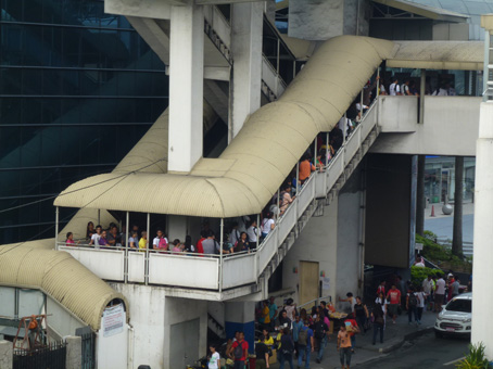 入場規制で階段で列をつくる首都圏鉄道(MRT)3号線の利用客=9日午前8時半ごろ、首都圏マカティ市のマガリャネス駅で写す