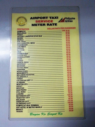 ぼったくりタクシーが乗客に提示する、高額な米ドル料金が書かれた料金表=11日、首都圏パサイ市で写す