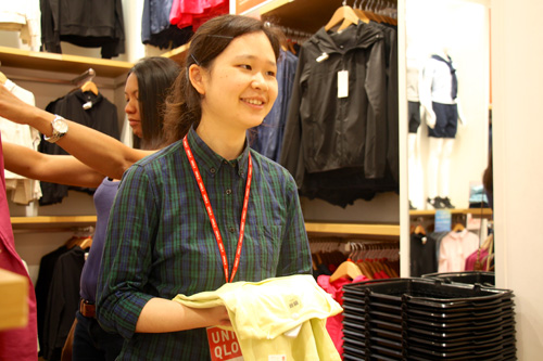 インターン最終日、笑顔で接客するあしなが奨学生の岡本さん=首都圏マカティ市商業施設SMマカティ店で写す