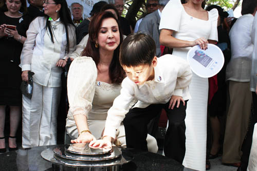 埋葬されたキリノ元大統領の遺骨が納められた墓石に手を触れるキリノ家の親族たち=29日午後1時ごろ、首都圏タギッグ市の英雄墓地で写す