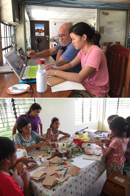 ?NGO創設者とともに作業をする山口さん(手前)。?グリーティングカードを作る協会メンバー