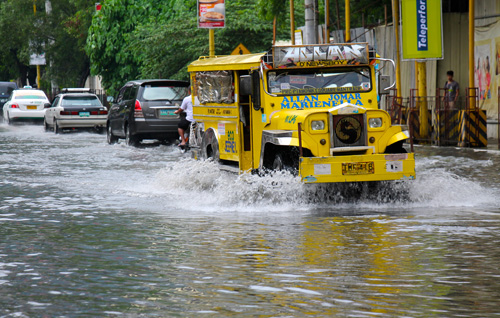 3日午後3時ごろ、首都圏マカティ市は激しい雨に見舞われ、各地で道路が冠水した。日本料理店などが多く集るパソンタモ通りとブエンディア通りの交差点周辺では、雨期になると、道路全体が川のようになる浸水被害が発生する。=3日午後3時45分ごろ、首都圏マカティ市のパソンタモ通りで冨田すみれ子写す