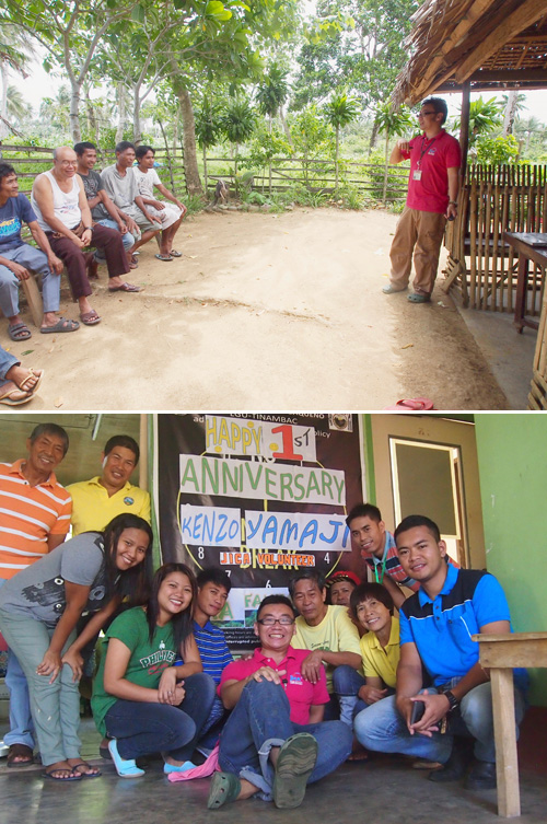 (上)地元住民らを前に有機農業の重要性について話す山路さん(右)。(下)農業事務所の同僚たちにフィリピン赴任1周年を祝ってもらう山路さん(中央)