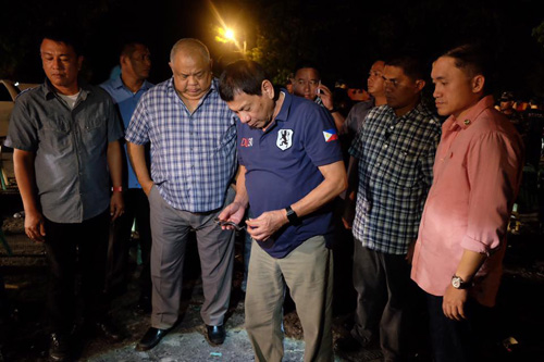 ダバオ市の爆弾テロ現場を視察するドゥテルテ大統領=大統領府提供