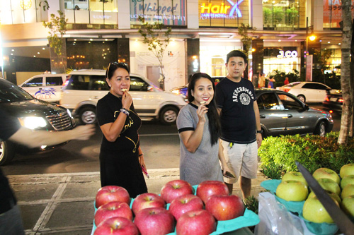 輸入されたリンゴを試食する通行人ら=17日午後6時ごろ、首都圏タギッグ市で森永亨撮影