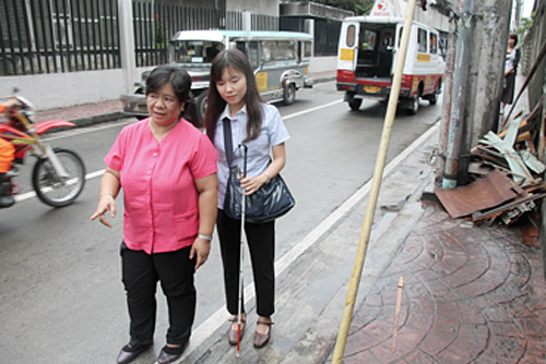 盲学校の周辺を歩く石田さん(右)。道路は段差ばかりで、ゴミも放置されている=首都圏パサイ市比国立盲学校で冨田すみれ子撮影