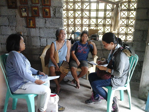 同僚とともに障害者の家庭を訪問し、現地語のアクラノン語でインタビューをする青木さん