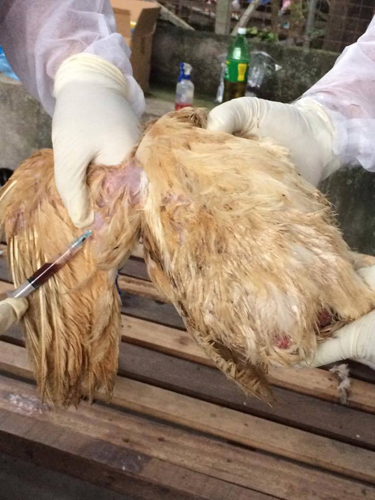 鳥インフルエンザの感染を調査するために鶏から血液サンプルを採取する農務省畜産局の職員=ピニョール農務長官のフェイスブックページより