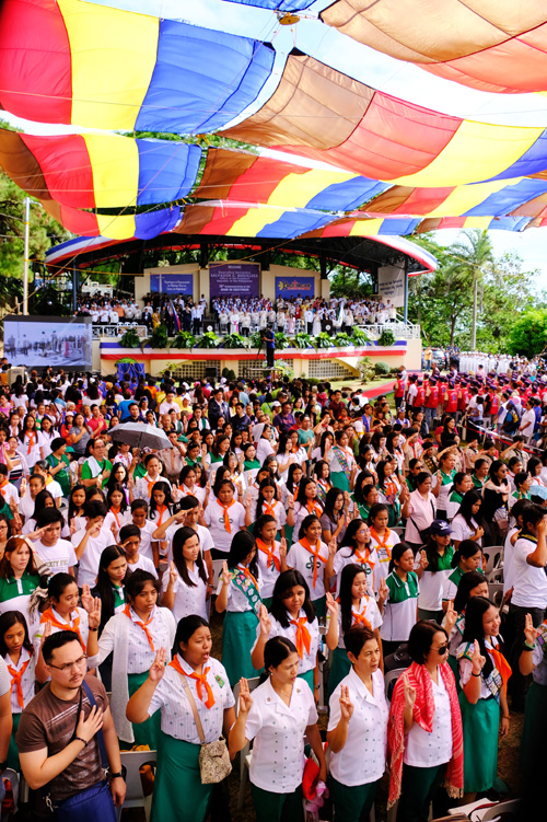 「勇者の日」記念式典で比国歌を斉唱する参列者=9日午前、サマット山で米元文秋撮影