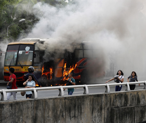 首都圏マカティ市の幹線道路でバスが炎上。けが人はなかったが大渋滞に(EPA=時事)