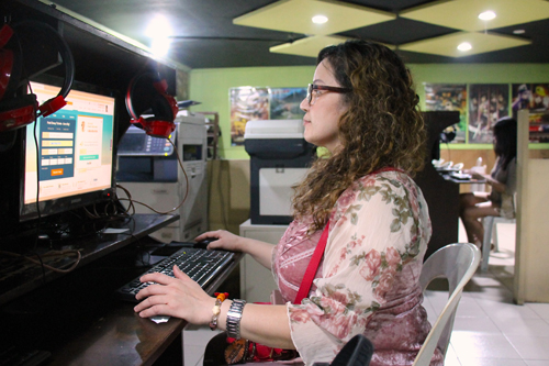 パソコン利用店でネットを利用し航空チケットを予約する女性=5日午後8時ごろ、首都圏マカティ市で冨田すみれ子撮影