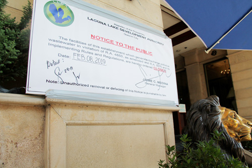 日系ネットワールドホテルの前にラグナ湖開発庁が掲げた勧告板=9日午後1時半ごろ、首都圏パサイ市のネットワールドホテル前で冨田すみれ子撮影