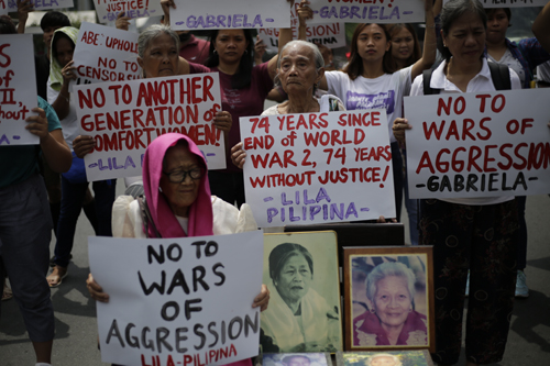 国際的な「慰安婦被害者の日」とされている14日、とされている14日、フィリピン人元慰安婦のナルシサ・クラベリアさん(2列目中央)と女性政党ガブリエラ...