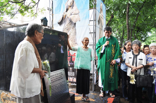 慰安婦像が再設置される予定だった台座の前で支援者たちに囲まれる元慰安婦のナルシサ・クラベリアさん(左から2人目)=25日午前9時半ごろバクララン教会で澤田公伸撮影