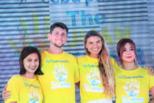セブパシフィックによる持続的観光推進の「大使」を務めるジャスミン・カーティスさん(左)とカナダ、オーストラリア、韓国のユーチュバーら=7日午後、ボホール州パングラオ島で石山永一郎撮影