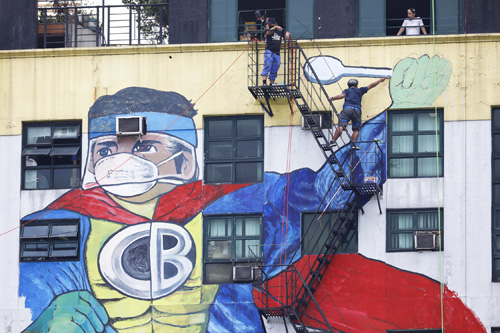 首都圏ケソン市のビルの壁面にペイントされたキャプテン・バーベル。医療従事者を励まし、讃える狙いという(EPA=時事)