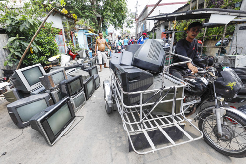 リサイクル業者が回収した後、路上に積まれている中古テレビ=3日、首都圏カロオカン市(EPA=時事)