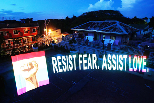 「恐怖に抵抗し、愛を後押ししよう」。LGBT(性的少数者)の「プライド月間」に、光を使った「ライトペインティング」がビルの屋上に掲げられている。