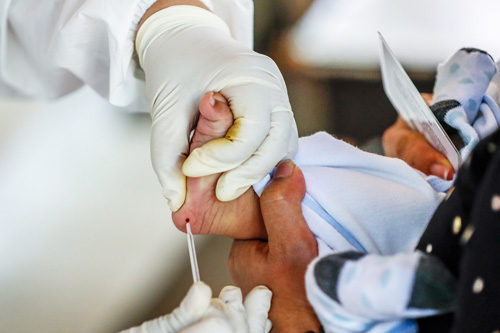 マニラ市内の病院でコロナ感染の簡易検査を受けている生まれて1カ月目の赤ちゃん=5月24日撮影(EPA=時事)