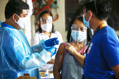 新型コロナウイルス対策のマスクとフェイスシールドを着けてインフルエンザ・ワクチンの予防接種を受ける女性。首都圏ケソン市で9月30日、高齢者と現場作業...