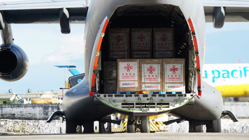 28日到着した中国軍の輸送機に積み込まれているシノバック製ワクチン=大統領府報道班提供