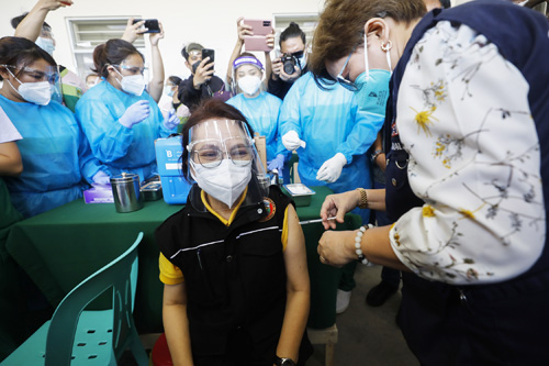 新型コロナに対する中国のシノバック製ワクチンに続き、4日にフィリピンに到着した英国のアストラゼネカ製ワクチンの接種も始まった。アストラゼネカ製は変異種への有効性がシノバック製よりも高いとされている=6日、首都圏パラニャーケ市の病院(EPA=時事)