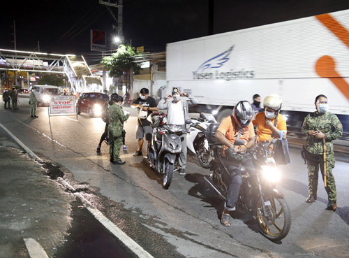 夜間外出禁止時間が首都圏で統一された初日、検問所で運転手の身分証明書を確認する警官=15日夜(EPA=時事)