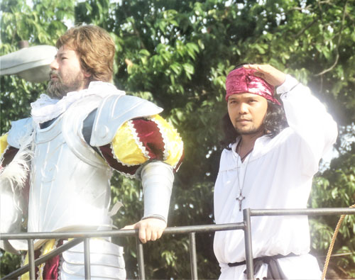 セブ市で2015年に行われたフマボン祭での寸劇で、マゼラン役の横に立ち、エンリケに扮するセブの男性(右)