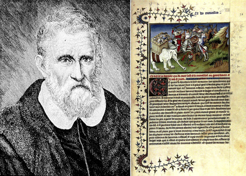 (左)16世紀にローマで描かれたマルコ・ポーロの肖像画。(右)マルコ・ポーロが存命中に発刊された「東方見聞録」(イル・ミリオーネ)のページ=ウィキメディア・コモンズ