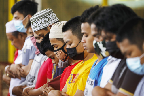 ラマダン初日に祈りを捧げるイスラム教徒の男性ら=4月13日、首都圏マリキナ市の屋内バスケットコートで(EPA=時事)