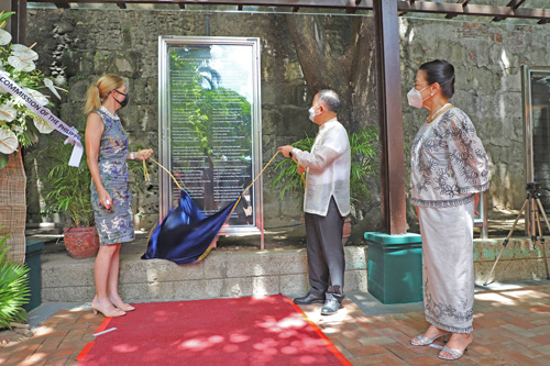 リサールのスペイン語の詩の一節をドイツ語に翻訳した記念碑の除幕式の様子=19日、リサール記念博物館内で(国家歴史委員会のフェイスブックより)
