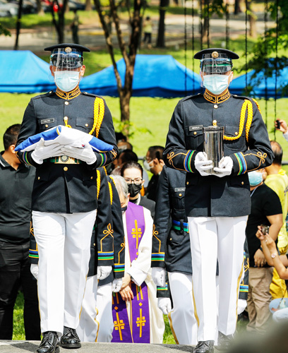 ノイノイ・アキノ前大統領の骨つぼを教会へ運ぶ儀仗兵(右)ら=25日、ケソン市のアテネオ大学(EPA=時事)
