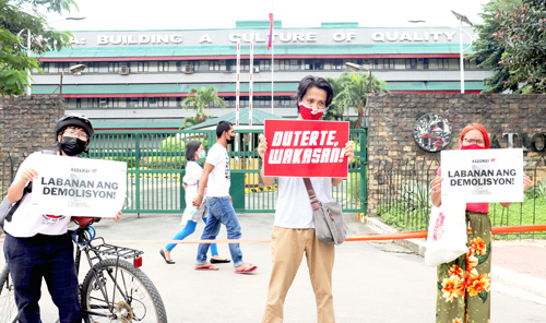首都圏ケソン市の国家住宅庁(NHA)前で15日午前、政府による住居取り壊しや強制立ち退きといった政策の即時停止を求める市民連合「アリャンサ・コントラ...