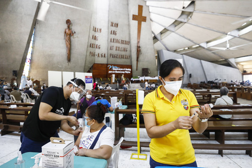 カトリック教会で新型コロナワクチンを住民に接種する看護師ら=13日、首都圏ケソン市(EPA=時事)