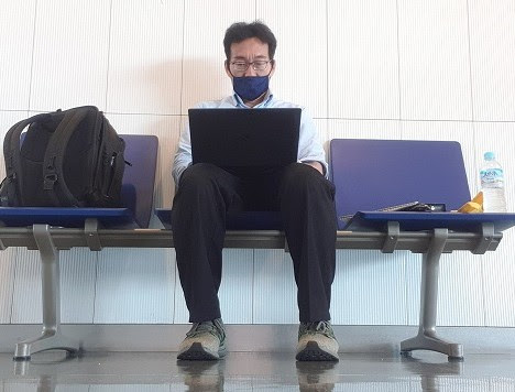 険しい表情で成田空港のベンチに座り、比退職庁に帰国便に搭乗できるよう支援を求めるメールを送る太田勝久氏。