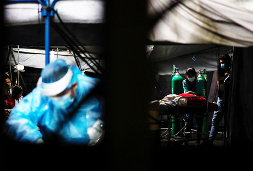 サンタ・アナ病院の建物の外に設けられたテントで患者のコロナ検査を行う医療従事者=16日、首都圏マニラ市(EPA=時事)
