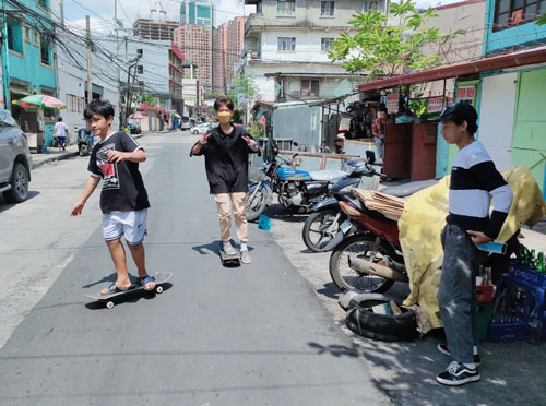 首都圏の防疫警戒レベルが4から3へと引き下げられ、スケートボードに興じる少年たちの姿も見られた=16日午前、首都圏マカティ市ピオデルピラールで岡田薫撮影
