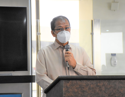 記者から質問を受け、ブルームバーグ回復力番付を批判するガルベス補佐官=28日、首都圏パサイ市ニノイ・アキノ国際空港で竹下友章撮影